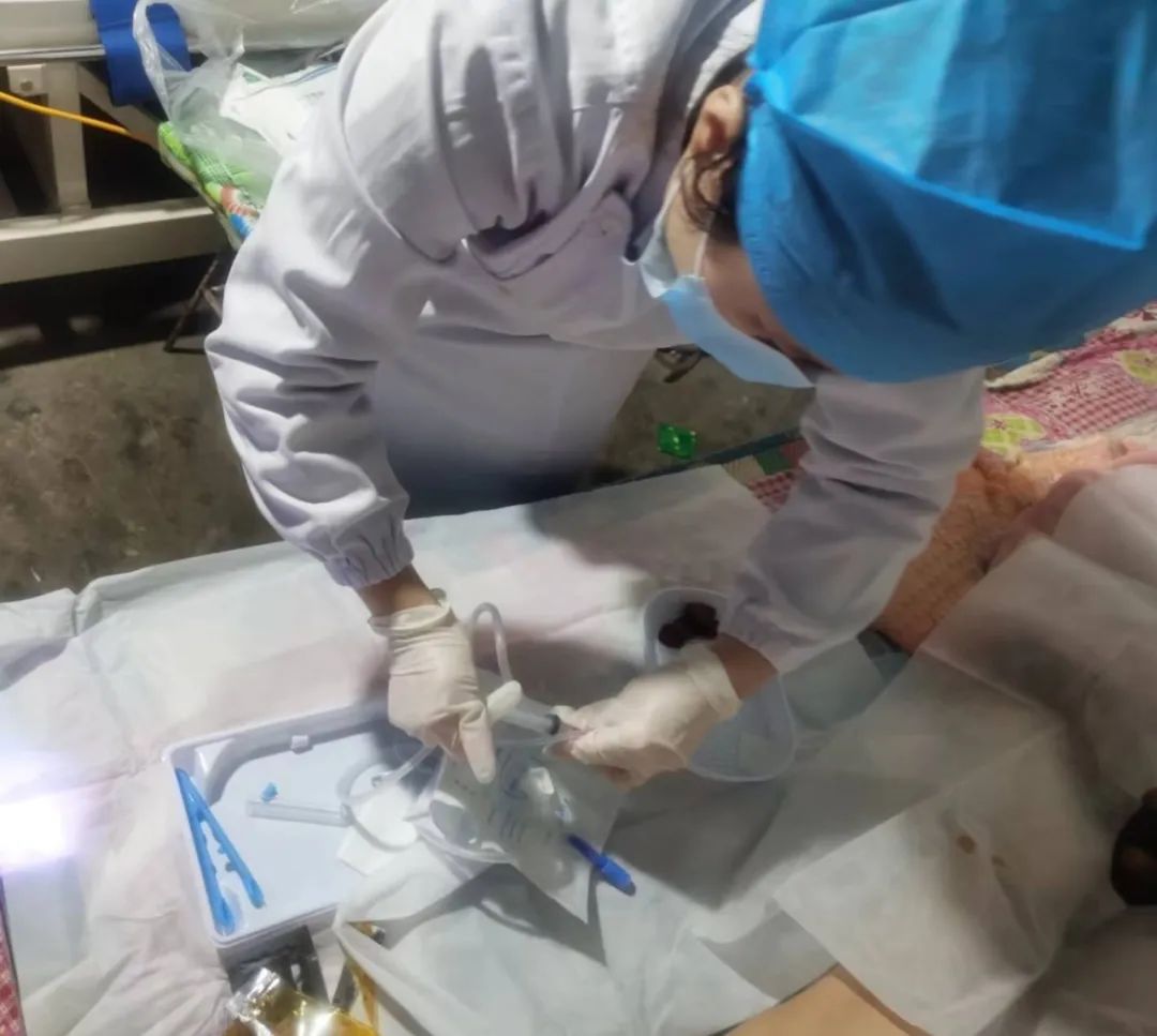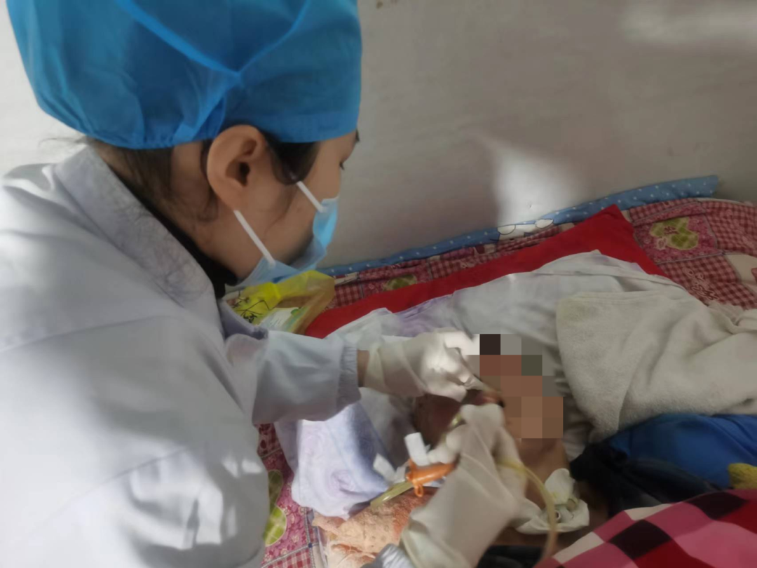 到達(dá)古阿姨家后,吳會(huì)護(hù)士長(zhǎng)的手搓了又搓,把器械貼著身體捂了又捂,等一切復(fù)暖,她才小心翼翼的為患者進(jìn)行操作:清潔、插管、聽(tīng)氣過(guò)水聲、牢牢固定,每一步都專(zhuān)業(yè)又細(xì)致,看著熱乎乎的飯菜通過(guò)胃管進(jìn)入患者的身體,她才徹底松了一口氣。置換胃管后,吳會(huì)護(hù)士長(zhǎng)帶著護(hù)士為患者處理了一些身體上的散在壓瘡,并給予了古阿姨及其母親全面的護(hù)理指導(dǎo)和健康宣教。