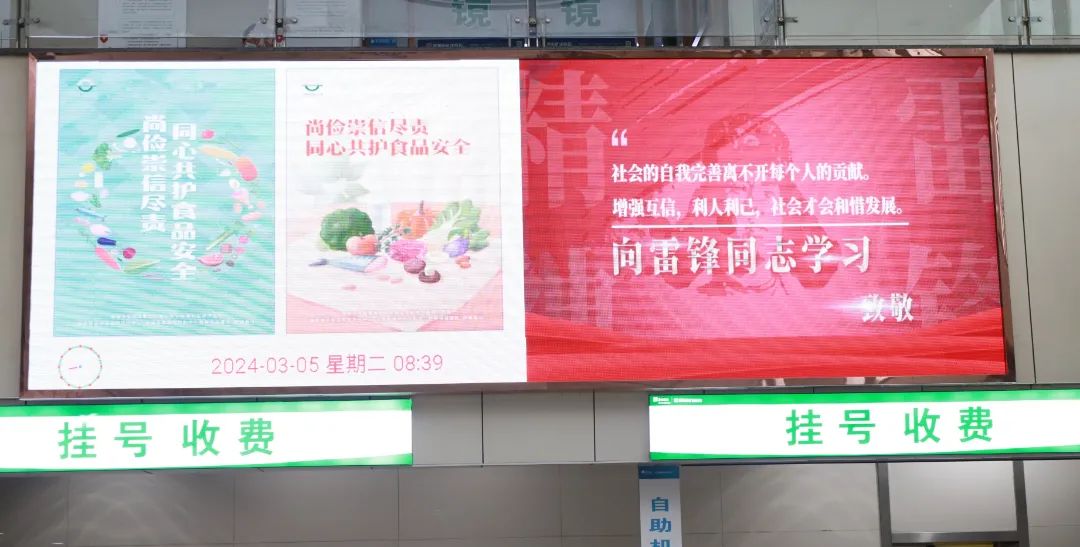 門診大廳LED屏滾動播放“向雷鋒同志學習”標語